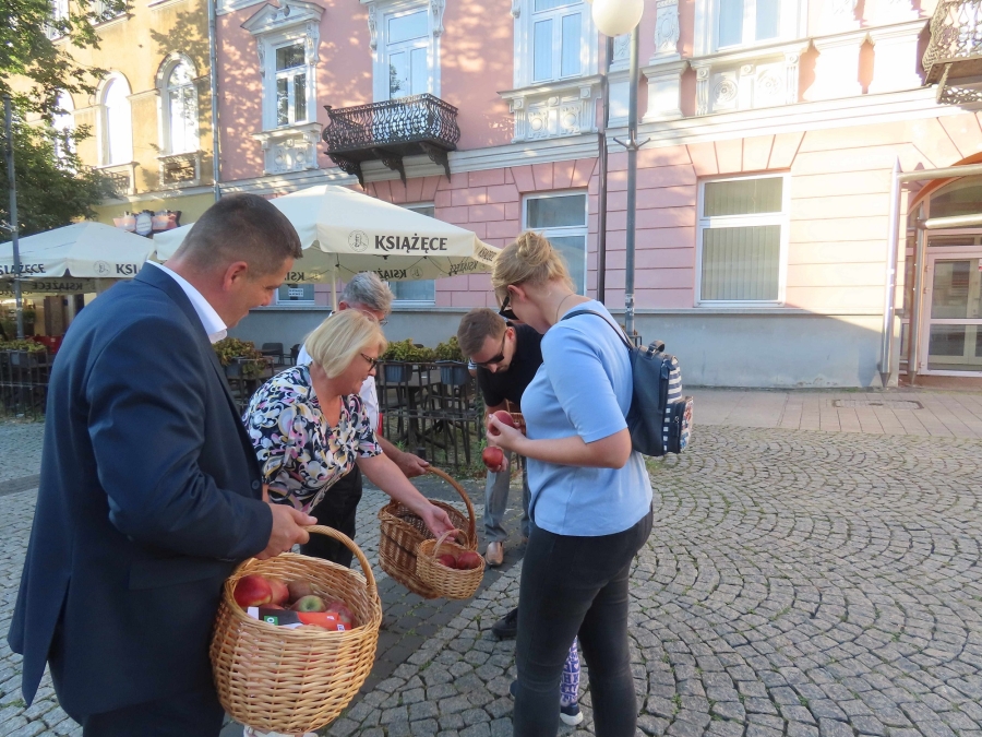 Z  tej  okazji dzisiaj  przeprowadziliśmy uliczną  akcję , mającą  na  celu  popularyzowanie  jabłek, jako najzdrowszego  owocu  świata, którego 45%  produkcji    w Polsce  pochodzi z  naszego  regionu .