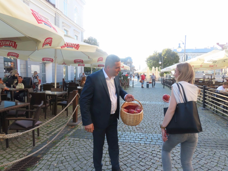 Z  tej  okazji dzisiaj  przeprowadziliśmy uliczną    akcję , mającą  na  celu  popularyzowanie  jabłek, jako najzdrowszego  owocu  świata, którego 45%  produkcji    w Polsce  pochodzi z  naszego  regionu .  Była to  dobra okazja  do  spotkań  z  mieszkańcami  i do  rozdawania  ulotek  przez  kandydatki  i  kandydatów do polskiego parlamentu.